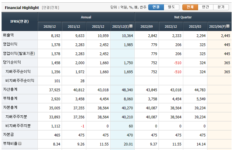 "한국앤컴퍼니"의 연결 재무 제표입니다. 2021년 에너지 솔루션 사업 본부 합병 및 신설 이후 영업이익이 급격히 증가하는 추세를 보입니다. 2023년 예상 실적을 확인해보니 매출액은 작년 2022년 동등 수준이나 영업이익이 확연히 감소한 모습입니다. 영업이익의 감소 원인은 판관비 상승도 아닌 원자재 가격 상승 기인한 매출 원가 상승입니다. 납축전지를 제조하는 회사이니 만큼 주된 원재료인 납을 수입 해서 사용을 하고 USD 기준으로 매입가격은 동일하나 환율 상승 원인으로 원화기준 원자재 가격이 상승하였습니다. 최근 원화 약세로 인해 환율이 다시 치솟고 있어 매출 원가 상승으로 인한 영업이익이 축소 될 수 있는 리스크가 있으니 해당 종목에 실적을 보고 투자를 하신다면 환율을 수시로 체크해야합니다.