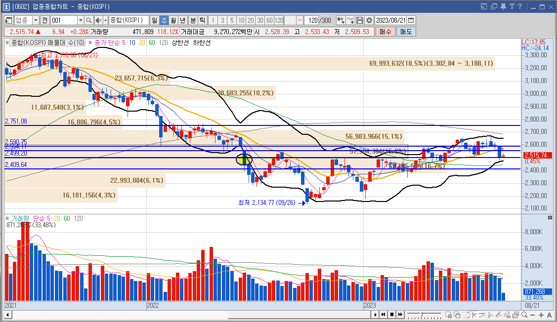 코스피 업종 종합 차트입니다. 금일 코스피 지수는 6.94 포인트 상승한 2.515.74 포인트로 마감했습니다. 지난주 2500 포인트를 깨고 내려가 다음 지지선까지 위협 받는 상황에서 다행히 주 막판에 들어올려 2500 포인트를 지지하였습니다. 기술적 분석으로 이동평균선 하락 추세 및 60선 이격으로 인하여 계속하여 2500 포인트를 위협 할 것으로 보입니다. 2550선을 터치하려는 흐름이 있어야 상승 흐름을 탈 가능성이 높아지니 지속 확인해보도록 하겠습니다. 그러나 앞으로 닥칠 위협 요인들이 많은데 대표적으로 8월 24일 예정되어있는 한국은행 8월 금통위, 엔비디아 실적발표, 잭슨홀 미팅등이 진행 될 예정으로 시장이 불안정한 상황입니다. 시장은 악재보다 불안정한 상태를 더 싫어하니 이는 하락의 요인이 될 수 있습니다.😥