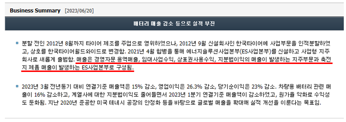 지주 "부문"이라는 것은 회사 내에 다른 사업도 진행하고 있다는 것을 나타냅니다. 한국앤컴퍼니는 지주 부문 외 2021년 4월 에너지 솔루션 사업 본부를 비교적 최근에 신설 하여 통칭 사업형 지주 회사로 사업 활동을 영위하고 있습니다. 매출액 비중은 ES사업본부의 차량용 배터리가 80.9%로 가장 비중이 높습니다. 한국앤컴퍼니는 요새 핫한 전기차 배터리를 만드는 곳이 아닌 일반 차량에 들어가는 납축 전지를 생산하는 회사입니다. 전기차용 배터리만 부각되는 요즘 시장에서 아직 내연 기관 자동차의 포션도 무시 못하니 의미가 있는 것 같습니다. 자동차 부품 사업 중 일부인 타이어 사업에서 더 나아가 배터리사업과 같이 다른 부품들로 진출 하는 모습이 인상적이네요. 타이어 사업을 바탕으로 쌓인 완성차의 전반적인 여러가지 노하우들이 있을테니 신규 합병한 배터리 사업이 빠르게 안정화 될 것으로 보이고 더 나아가 다른 부품 사업까지 진출 할 가능성이 있을 것 같습니다