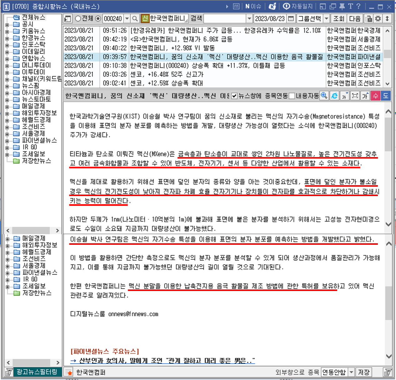 "한국앤컴퍼니"의 종합 시황 뉴스입니다. 뉴스를 확인해보니 초전도체에 이은 테마주인 맥신 관련주로 엮여 있었네요.😮 맥신은 전자 기기의 전자기파 간섭을 없애는 차폐 기능 및 높은 전기 전도성을 갖춘 소재입니다. 맥신은 표면 특성이 중요하여 표면의 정밀한 분석이 중요한데 현재 있는 현미경으로는 분석이 까다로워 대량 생산이 어려웠으나 최근 한 연구팀에서 표면 분석 방법을 신규로 개발하여 대량 생산의 길이 열렸기 때문에 해당 기술이 주목받고 있습니다. 이에 "한국앤컴퍼니"가 맥신 관련 특허를 보유하고 있기에 관련주로 엮인 상황입니다.